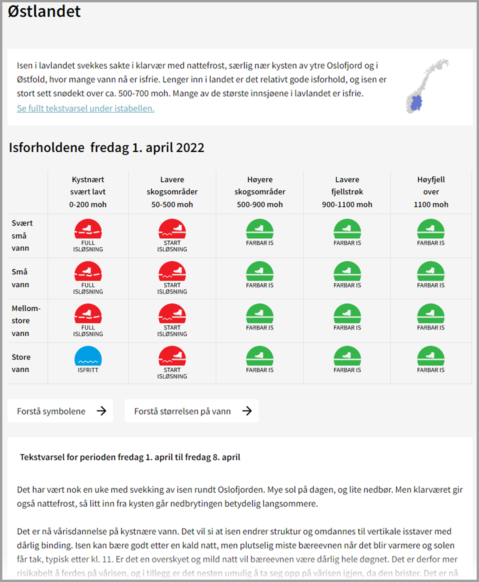 Ukentlig sender NVE ut isvarsler i syv regioner på varsom.no/isvarsling. Varselet fokuserer på om det er noe spesielt med issituasjonen, samt hvor høyt man må for å kunne finne farbar is.