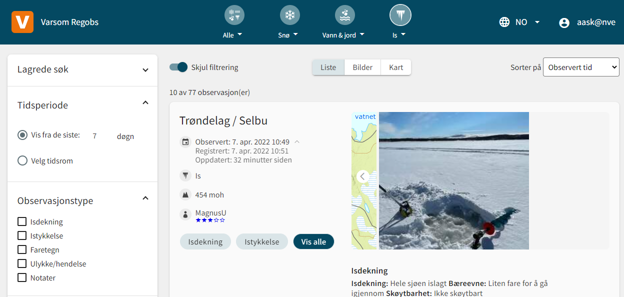 I Regobs kan du se observasjoner fra alle naturfarer i kart og tabell. Likevel vil vi for isobservasjoner anbefale kartløsningen Iskart.no. Data som sendes inn til Regobs blir umiddelbart synlig i iskartet. Der kan du også se tidligere observasjoner fra samme målested, plotte isdekninger og istykkelser, og laste ned data med statistikk.
