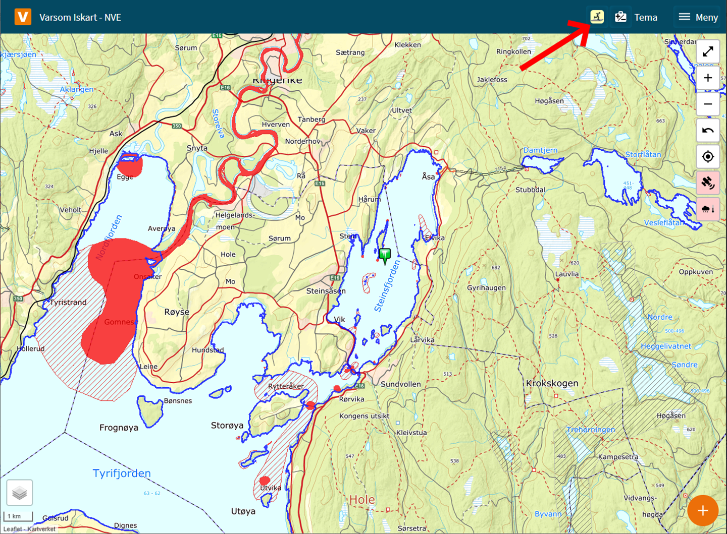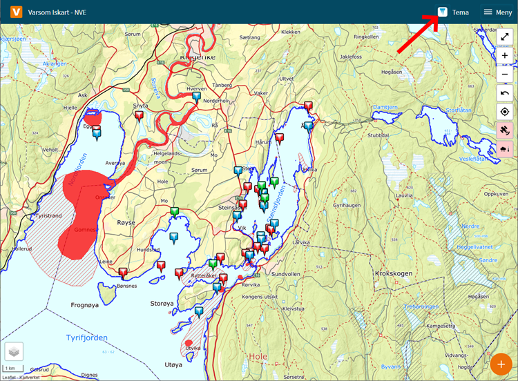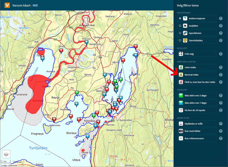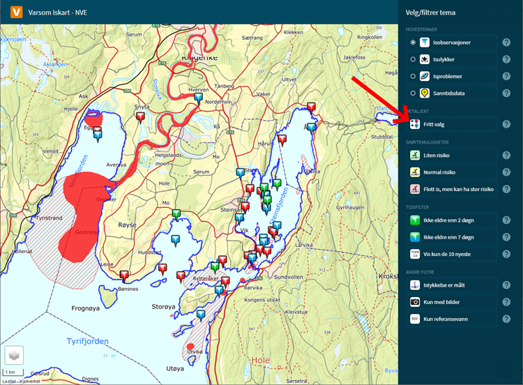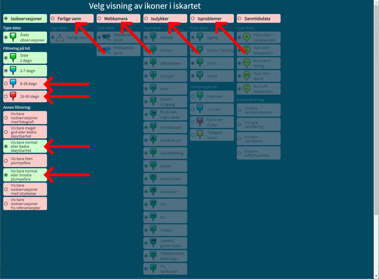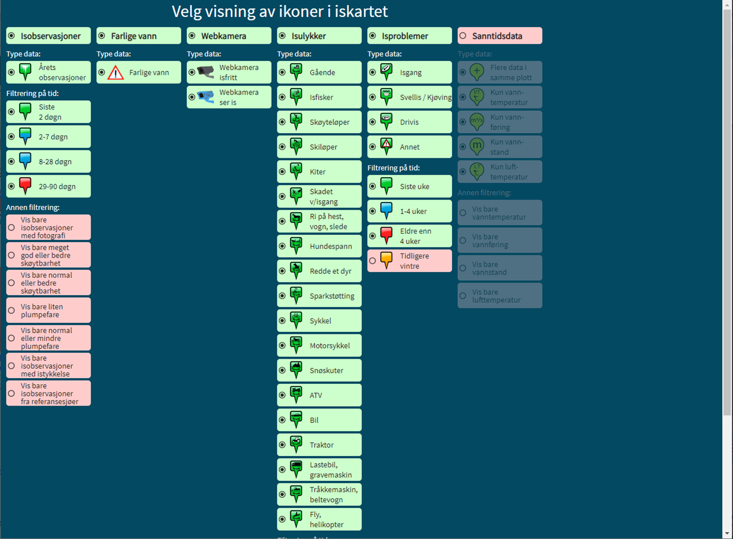 Når du velger et tema vil iskartet vise symboler som tilfredsstiller visse krav. Velger du temaet "Isobservasjoner", som er standard valg i iskartet, vil du se alle isobservasjoner de siste 90 døgn, og du vil se webkameraer og Farlig vann informasjon, samt isulykker og isproblemer fra inneværende vinter. Men iskartet gir deg mulighet til å stille andre krav til visningen.