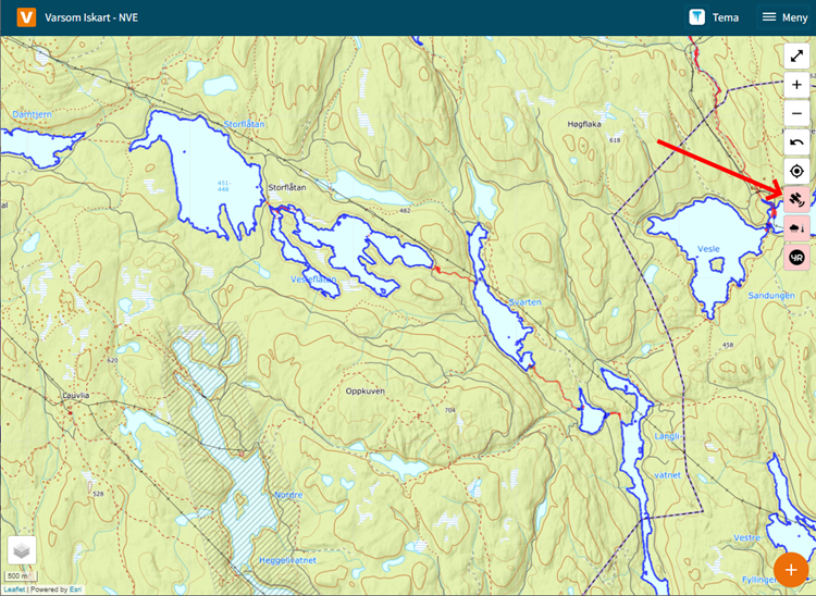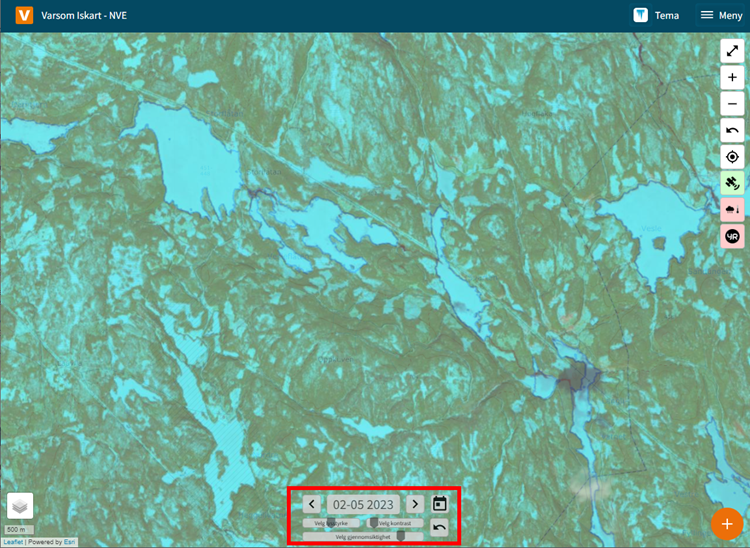 Den nederste slideren gjør at du kan se det underliggende kartet gjennom satellittbildet. På regulerte vann kan det være nødvendig å skru av svekket is visningen med kartlag-symbolet nederst til venstre, for de røde områdene kan skjule satellittbildet for mye.