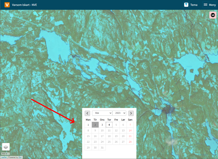 Nederst på siden ser du datovelger og bildeinnstillinger. Du hopper en dag av gangen med pilsymbolene, eller velger dato fra kalendersymbolet. Der kan du hoppe i måneder med pilsymboler eller velge måned/år fra nedtrekksmenyer.