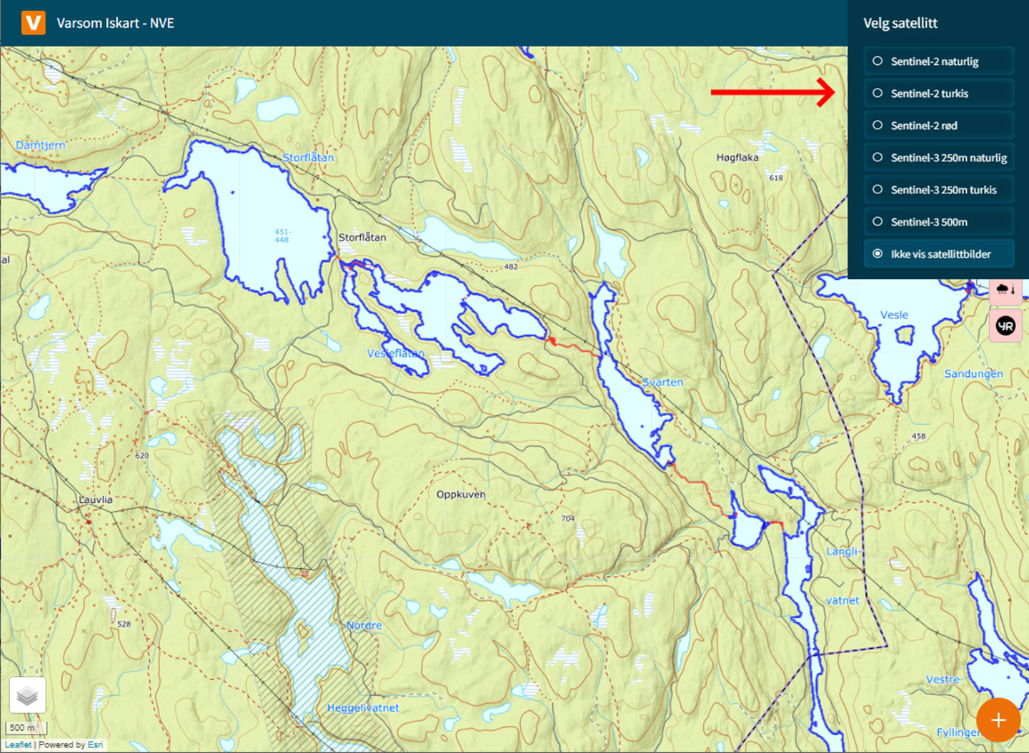 Satellittbilder fra ESA kan vises oppå iskartet. Du aktiverer satellittbilder ved å trykke på satellittknappen til høyre. Er den allerede grønn, så er tjenesten på. Du avslutter visningen med samme knapp. Det er flere valg, der særlig turkis egner seg for snø og is. Det er fra den optiske satellitten Sentinel-2.