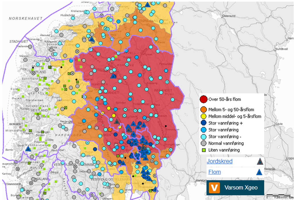 Flere er allerede rammet av flom- og jordskredhendelser i Oslo, Viken og Innlandet. Mange veier er stengt på grunn av lokale oversvømmelser, flom eller jordskred. Vannføringen har nådd oransje og rødt nivå i flere små vassdrag i Viken og i den sørligste delen av Innlandet.