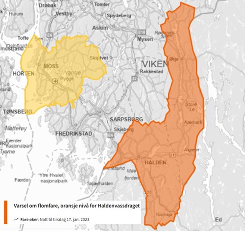 Oppdatering 20.01. kl. 11. Norges vassdrags og energidirektorat (NVE) varslet mandag 16.01 flom på oransje nivå i Haldenvassdraget. Årsaken var store mengder regn og snøsmelting i forrige uke. Fredag 20.01 er varselet nedjustert til gult nivå