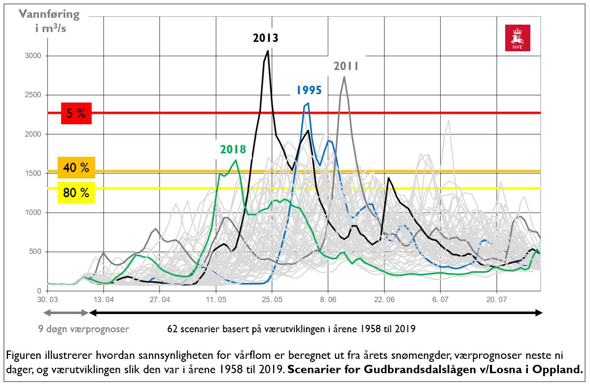 Figuren illustrerer hvordan sannsynligheten for stor vårflom er beregnet ut fra årets snømengder, værprognoser neste ni dager, og værutviklingen slik den var i årene 1958-2019.