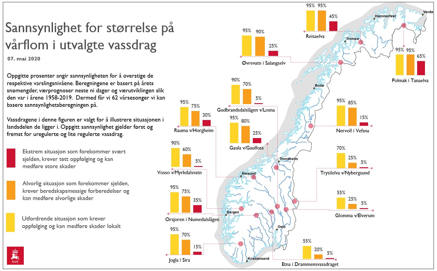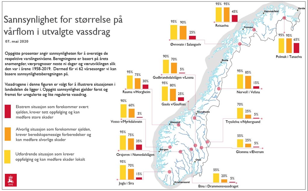 Sannsynligheten for stor vårflom er aller størst i Nord-Norge, med opp mot 90% sannsynlighet. Med stor vårflom mener vi her flom på oransje nivå. Det vil si en flom som kan medføre alvorlige skader.