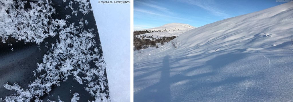 Fra flere observasjoner fra Regobs vet vi også at vi allerede har vedvarende svake lag av kantkorn, begerkrystaller eller rim i snødekket, og mange har hørt og sett krystallklare faretegn som massive drønn og skytende sprekker. I tillegg er det meldt om fjernutløste skred og skred som er lett å løse ut.