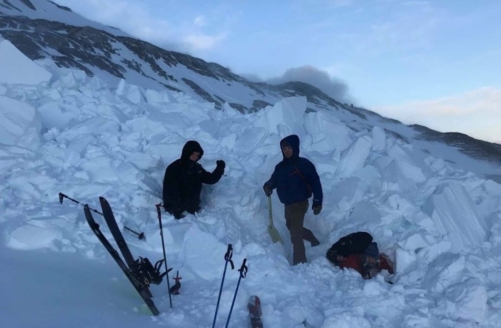 Skredet var nå over. Jeg så bare hodet til Kompis1. Noe mere av kroppen til Kompis2. De begge satt fast i snøen. Hvor var Kompis3? Jeg spurte om det gikk bra med de og om de var skadet. Ingen var skadet, men de satt fast. «Hva skal vi gjøre?», spurte jeg. Kompis2 sa at han hadde en spade i sekken som han fikk lirket frem til meg. Jeg begynte å grave frem Kompis1 siden det bare var hodet som stakk frem på han. Vi ropte ut flere ganger, «Kompis3!?», i en stressende fortvilelse. Vi ble veldig bekymret for sistemann da sekundene raste fra oss.