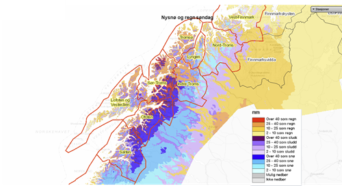 Søndag ventes vinteren å være tilbake i fjellet i Nordland og Troms. Kilde: xgeo.no