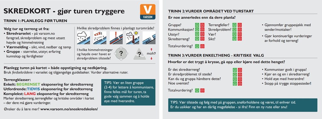 - Vi har dessuten laget en sjekkliste som det kan være lurt å gå igjennom og dersom dere svarer negativt på noen av spørsmålene, bør dere gå en ekstra runde og gjøre de ekstra vurderingene som kan avgjøre om det er en trygg tur eller ikke dere begir dere ut på sier Svartstad Andresen. - Som alltid er kommunikasjon nøkkelen. Snakk sammen og gjør vurderinger i felleskap både før turen og underveis. Registrerer dine observasjoner i regObs så bidrar du til at andre også får den informasjonen du ser.