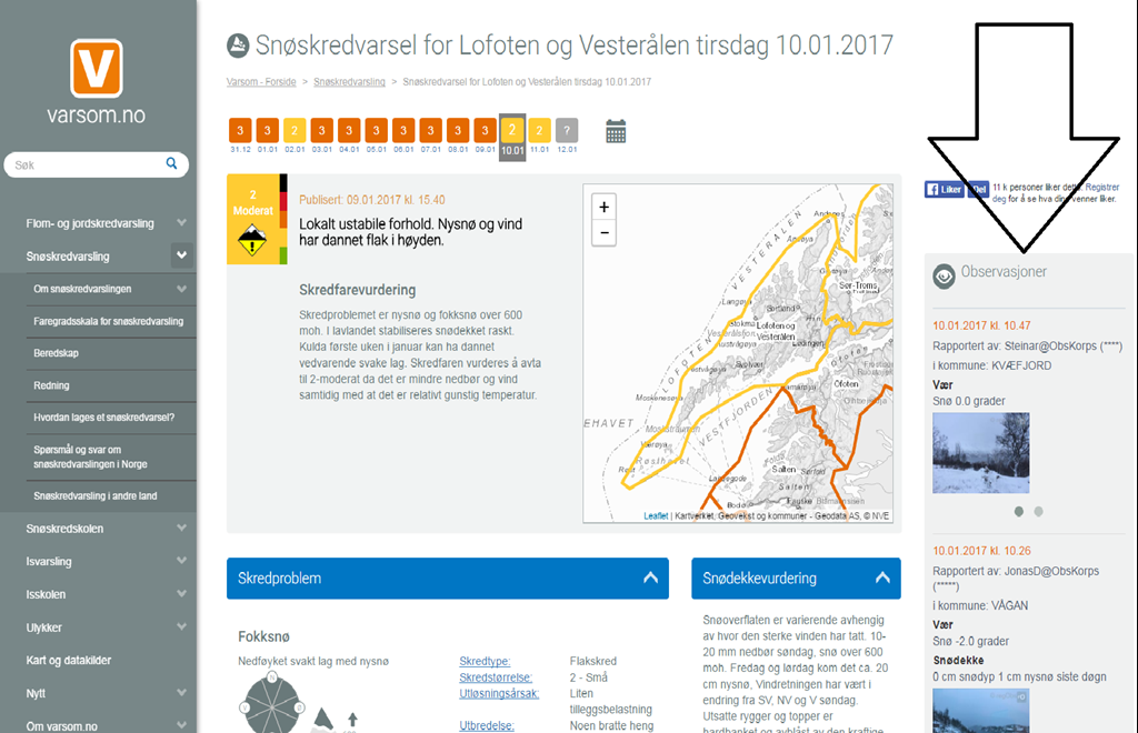 Nå kan du igjen se siste observasjoner ved siden av snøskredvarslet på Varsom. På stor skjerm vises de til høyre for varslet, mens på mobil finner du de siste observasjonene rett under varslet ved å bla ned til dem. Observasjonene kommer direkte fra regobs og er oppdatert i sanntid.