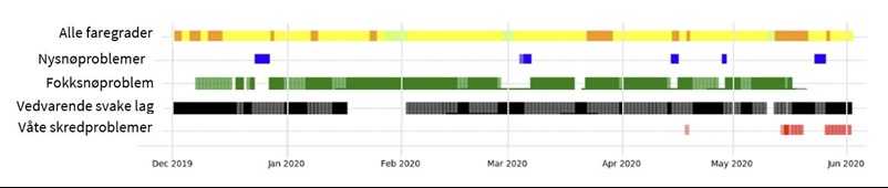 Selv om våte skred har vært et av skredproblemene den senere tiden er det fokksnø og vedvarende svake lag som i hovedsak har dominert gjennom sesongen , slik figuren under viser.