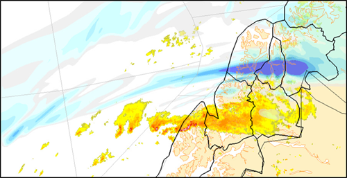 Det var nettopp det som skjedde onsdag (26.02) i Nord-Norge der modellen på morgenkvisten ville ha opp mot 60 mm nedbør i Tromsø og Lyngen. På grunn av dette ble skredfaren i disse to regionene justert opp til faregrad 4 - stor. Senere på dagen justerte modellen nedbørmengdene noe ned, og når "fasiten" kom senere på kvelden viste det seg at bygelinjen traff lenger sør enn det modellen hadde tidligere på dagen, som i figuren ovenfor.