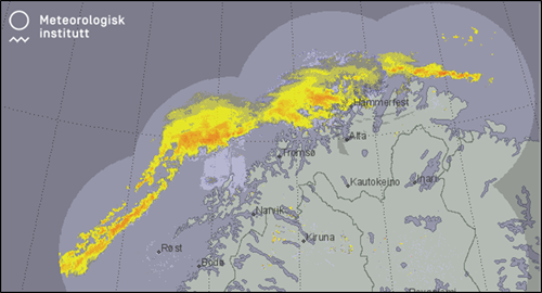 Kystparallell bygelinje i havet utenfor Nord-Norge som får lite konsekvens for skredfaren i Troms, men gir nedbør i Vest-Finnmark og på Finnmarkskysten.