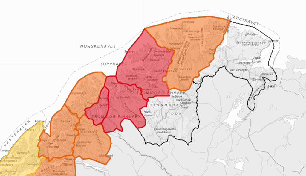 Det er ventet stor snøskredfare nord i Troms og i Vest-Finnmark torsdag og fredag. Det er fare for at det vil løsne store skred av seg selv. Enkelte skred kan også bli svært store og nå langt utover flatere områder. Snøskredvarslingen / NVE anbefaler å unngå alt skredterreng, både løsneområder og utløpsområdene for skred.