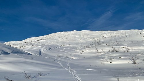 På tross av godt med påfyll av snø for en drøy uke siden er det fremdeles mindre snø enn normalt i Ofoten. Foto: Marius@Obskorps // Regobs