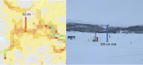 Like fullt kan det være lokale forskjeller, som gjør at kartene gir et litt feil bilde av forholdene. For eksempel vet vi at det er mye snø i Øverbygd i Indre Troms, men fem ganger så mye som normalt, slik kartene viser, er trolig å dra den litt langt.