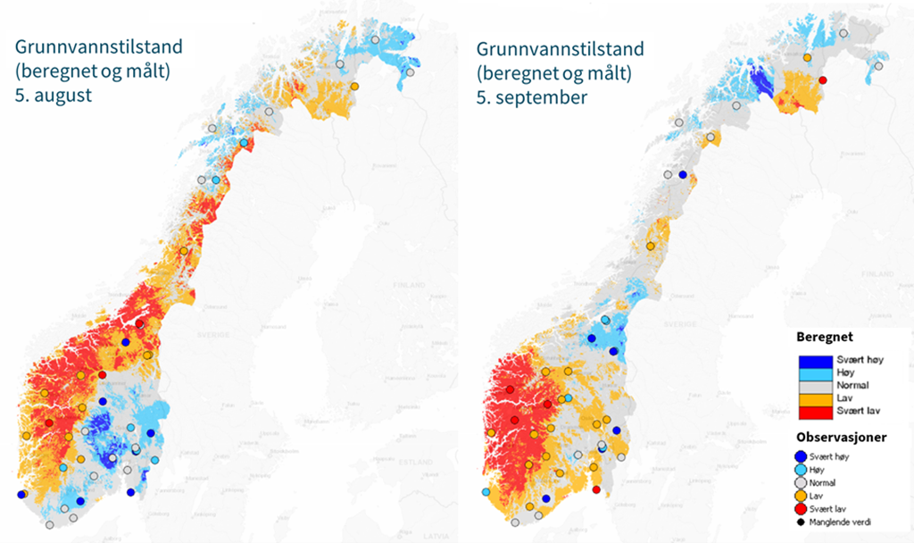 Per 5. september er det lav grunnvannstand i store deler av Sør-Norge. Både beregnet grunnvannstand og målinger indikerer at det stedvis, særlig i Vestland fylke og Møre og Romsdal, er svært lav grunnvannstand sammenlignet med normalen for referanseperioden 1981-2010.