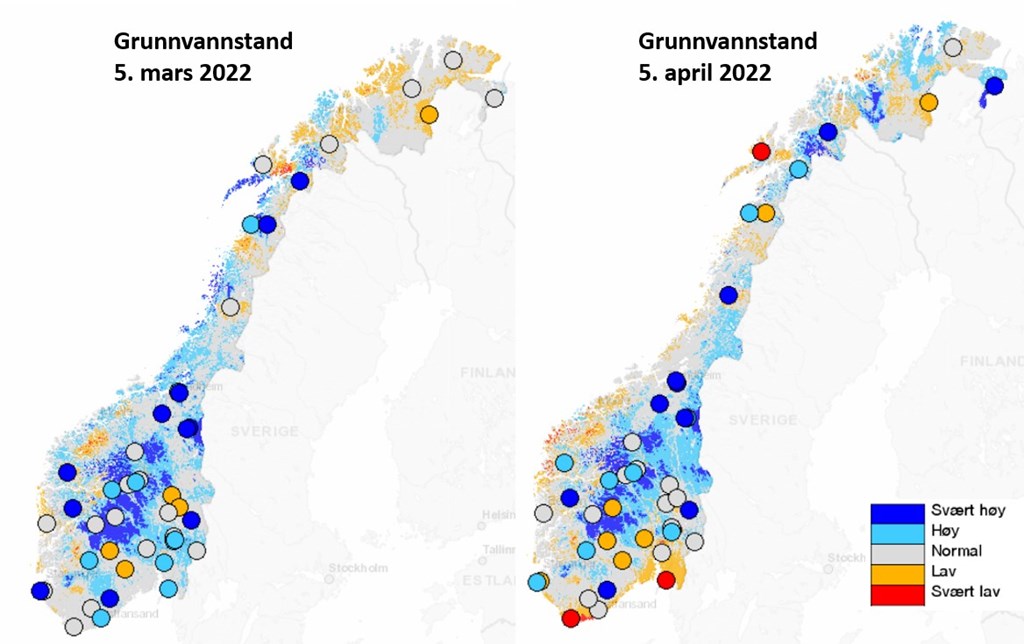 Det er nå generelt store forskjeller i grunnvannsnivå i landet. Langs kysten i Sør-Norge er det nå lav til svært lav grunnvannstand, mens det i indre strøk og fra Trøndelag til Finnmark derimot er generelt normal til høy grunnvannstand for årstiden.
