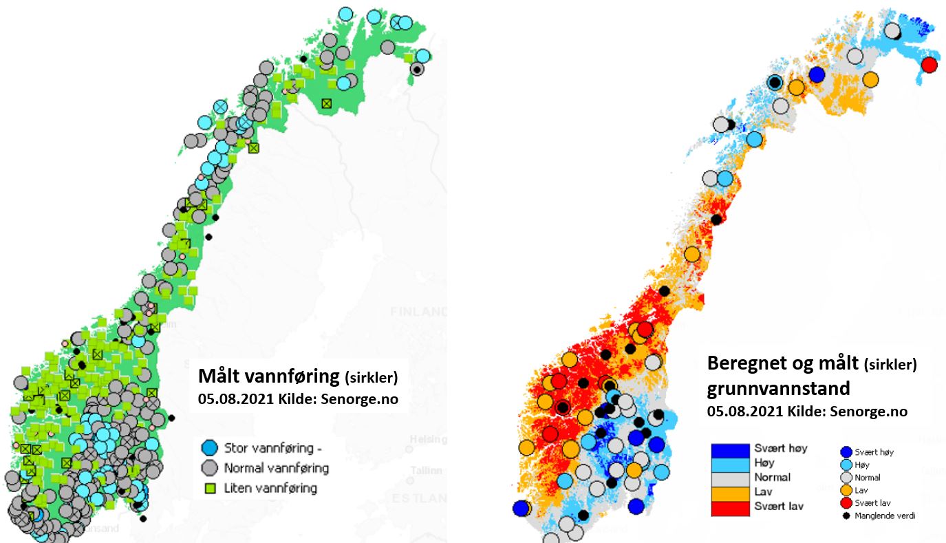Per 5. august 2021 er det lav og synkende grunnvannstand fra Nord-Rogaland til sør i Nordland. Både beregnet grunnvannstand og målinger indikerer at det stedvis, særlig i indre strøk av Vestland fylke, Møre og Romsdal og Trøndelag, er svært lav grunnvannstand sammenlignet med normalen for referanseperioden 1981-2010. Svært lav grunnvannstand (dvs. under 5-persentil) betyr at det i gjennomsnitt over en lang periode går 20 år eller mer mellom hver gang grunnvannstanden på denne tiden av året er like lav.
