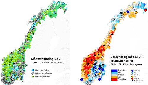 Kart over målt vannføring pr. 5. august 2021. Observasjonene er klassifisert på grunnlag av statistikk (persentiler) for målestasjonene. Beregnet og målt grunnvannstand pr. 5. august 2021. Verdier er i forhold til gjennomsnittlig grunnvannstand for samme dato i referanseperioden 1981-2010. Grunnvannstanden er simulert ved bruk av HBV-modellen.