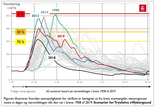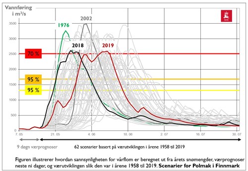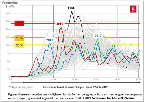 Figuren illustrerer hvordan sannsynligheten for stor vårflom er beregnet ut fra årets snømengder, værprognoser neste ni dager, og værutviklingen slik den var i årene 1958-2019.