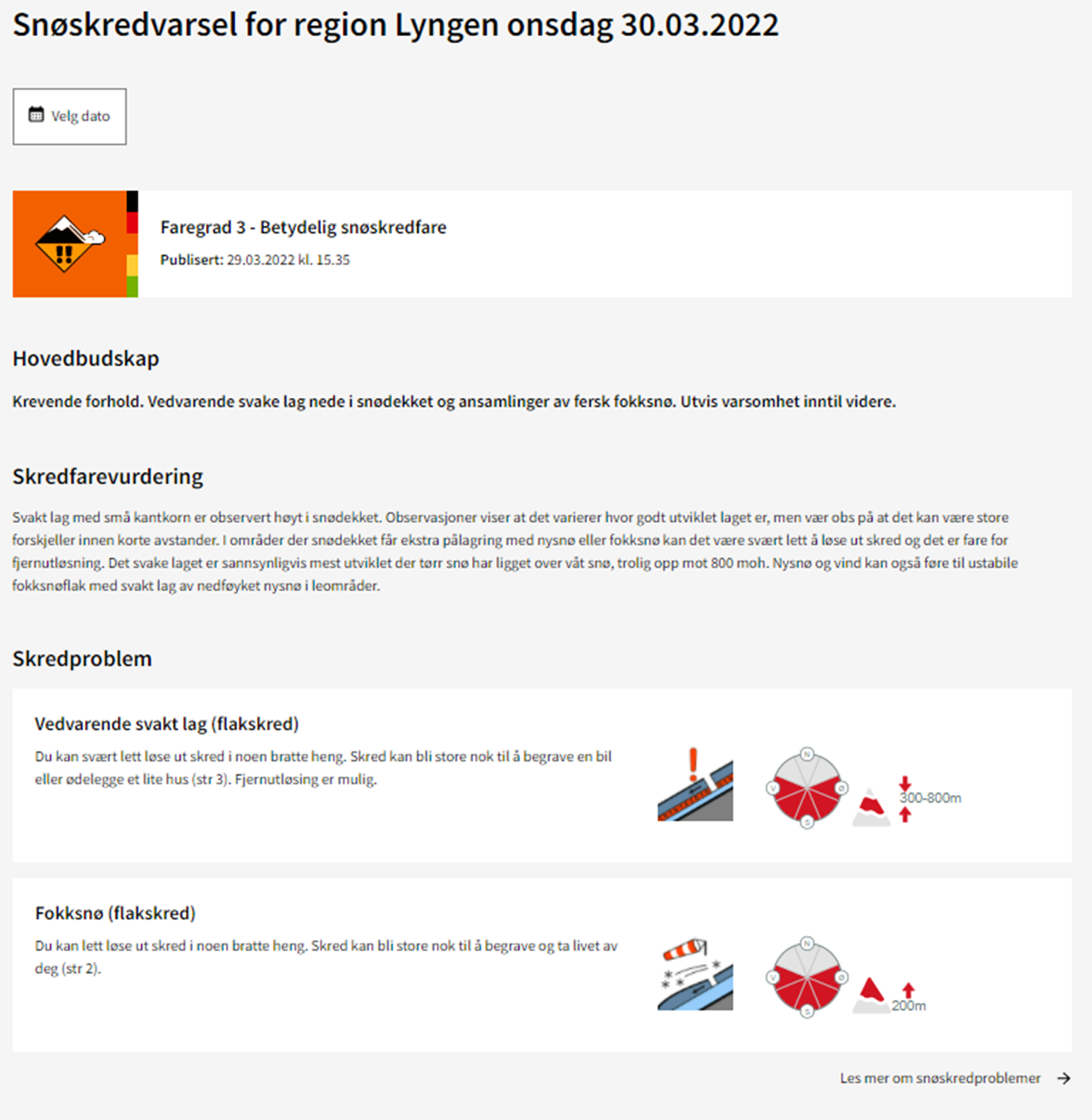 Les meir om kva dei forskjellege elementa i skredvarselet betyr her.